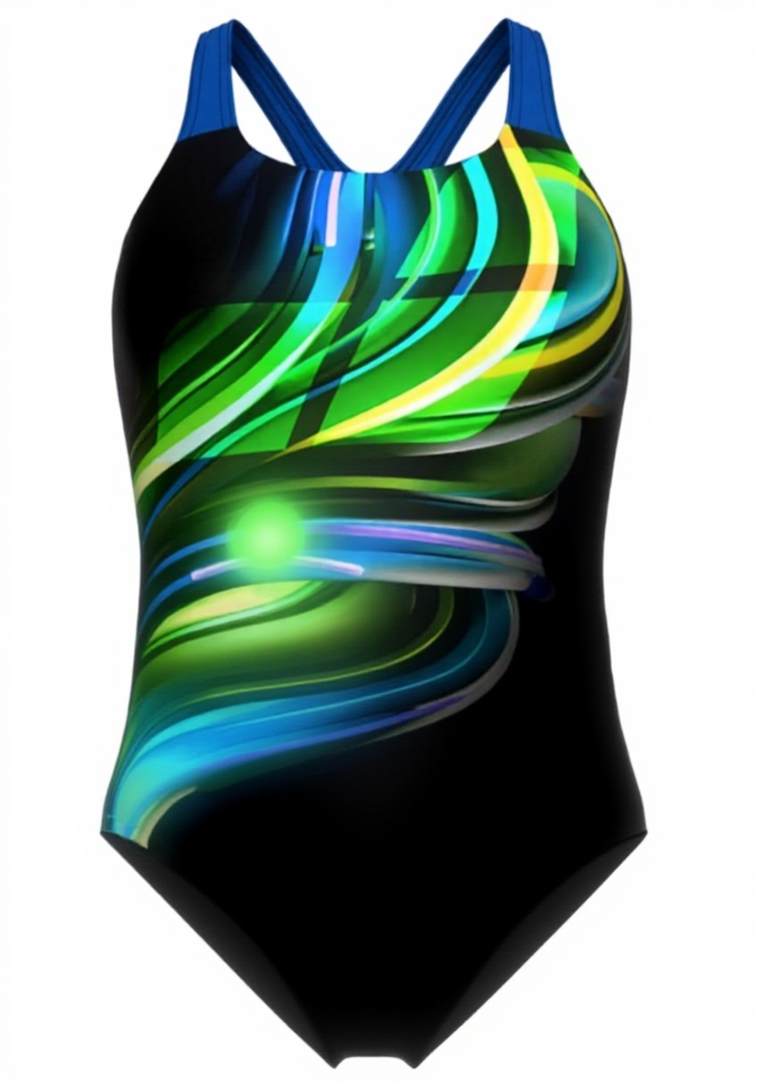 Disponibile nelle taglie 42, 46, 48, 50 e 52, con colore Multi Black-black-blue China. Il modello include spalline ampie, reggiseno interno e taglio posteriore ergonomico per un sostegno aggiuntivo. Tessuto foderato sul davanti per maggiore comodità, con composizione 80% poliammide e 20% elastam (tessuto ecologico: 100% poliammide riciclata).