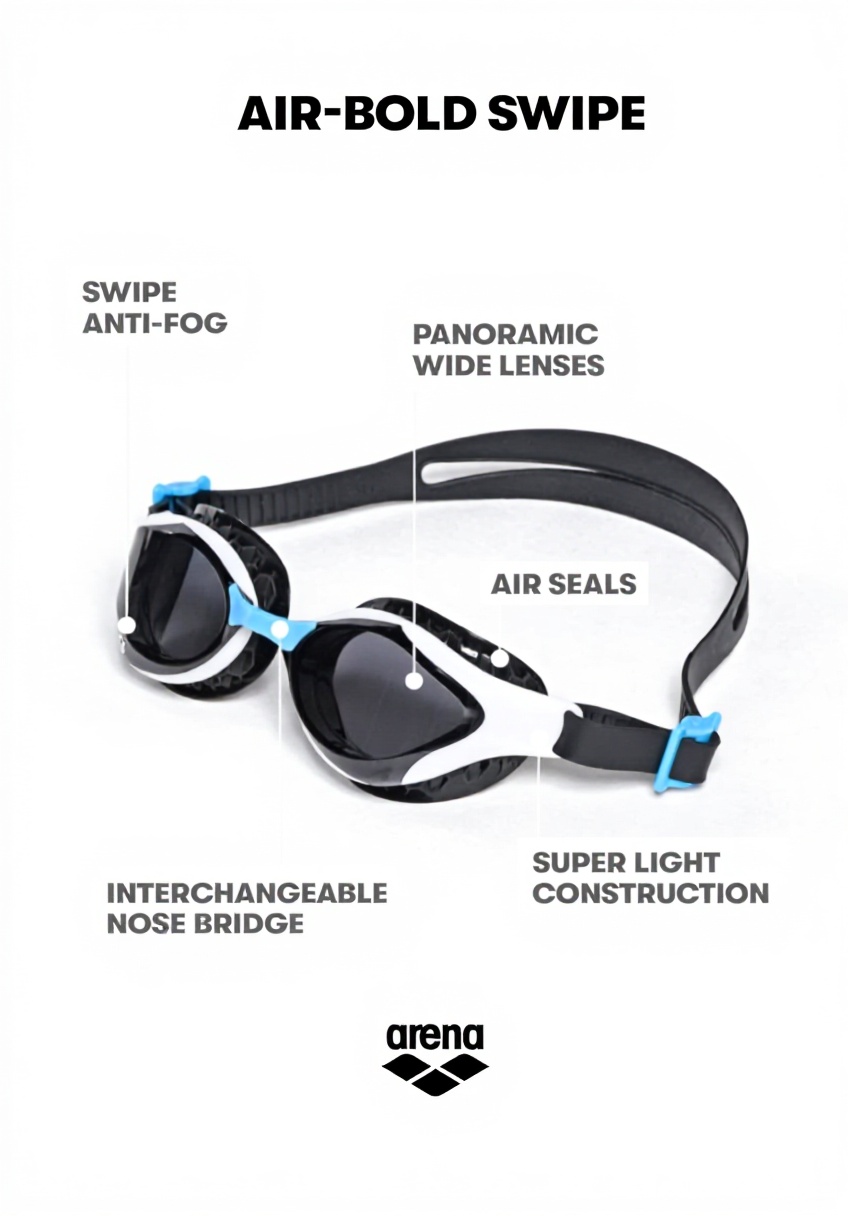 Gli occhialini ARENA Air-bold Swipe uniscono design ergonomico e tecnologie avanzate per massimizzare comfort e prestazioni. Dotati di ampie lenti con protezione UV, garantiscono un’ottima visibilità laterale. Il cinturino singolo regolabile ai lati assicura una calzata stabile e personalizzabile, adattandosi a diverse forme del viso senza causare pressioni eccessive.